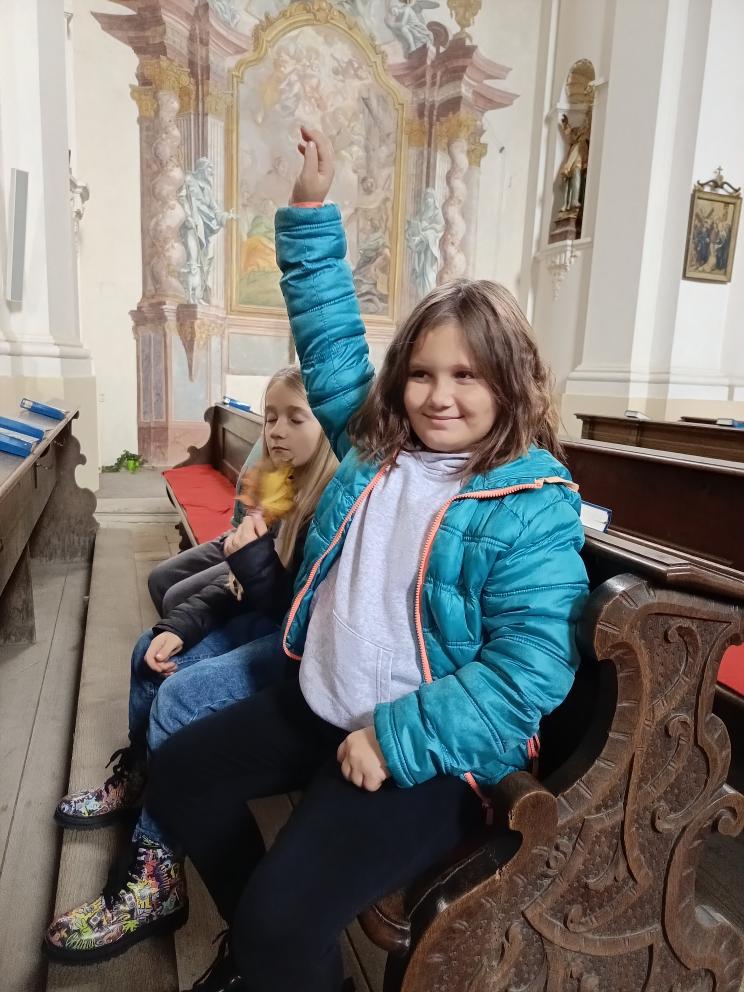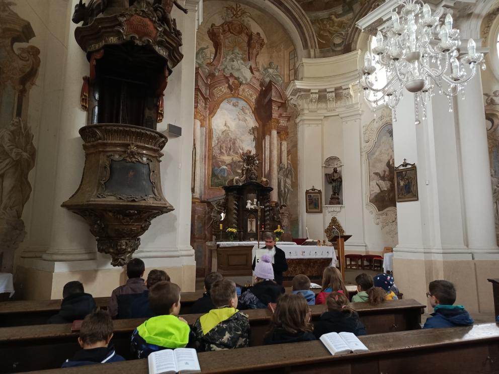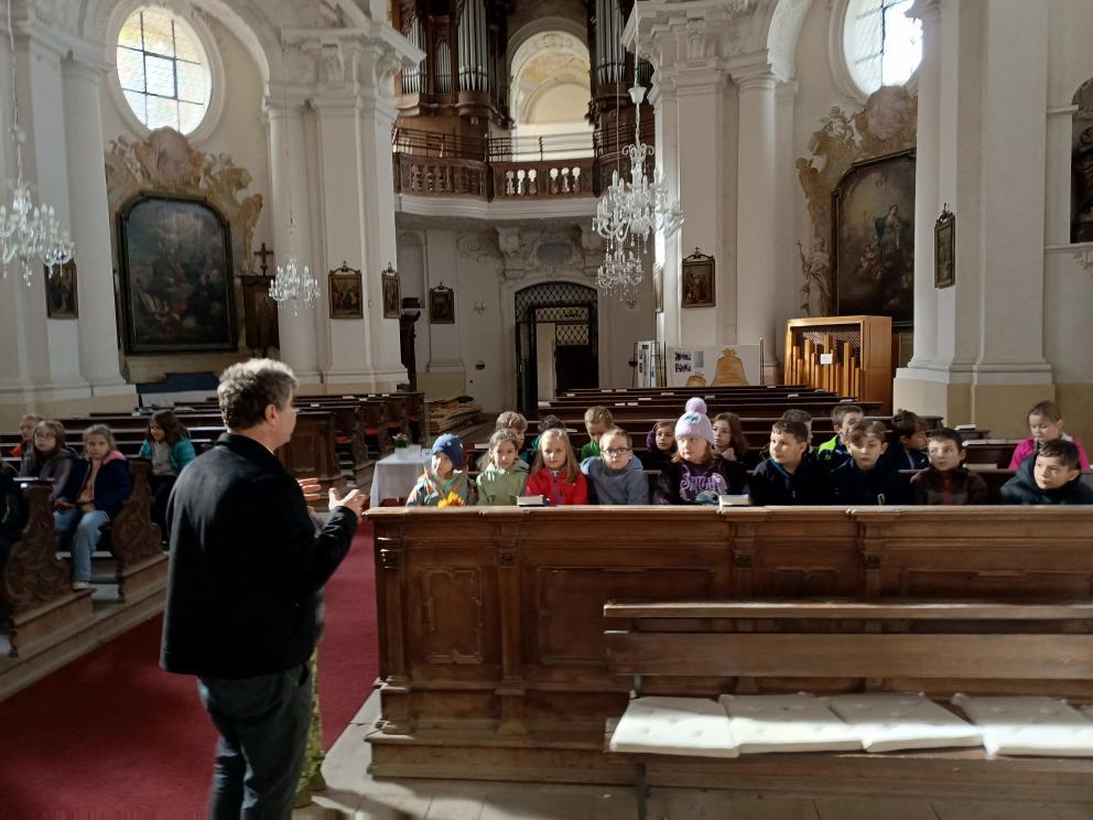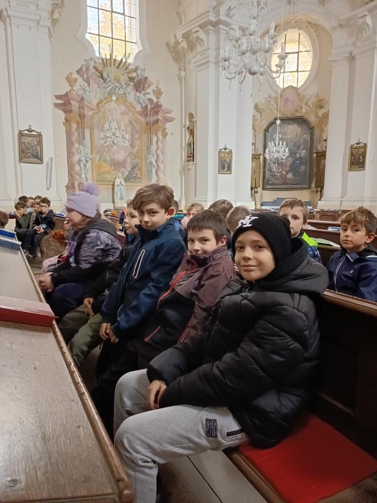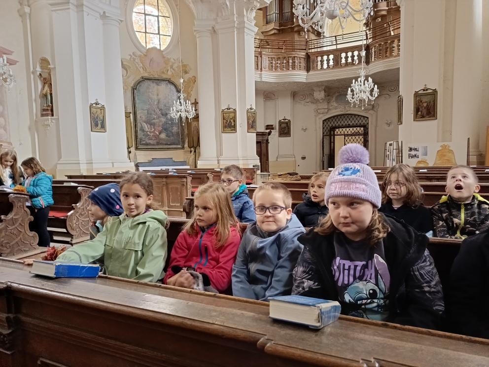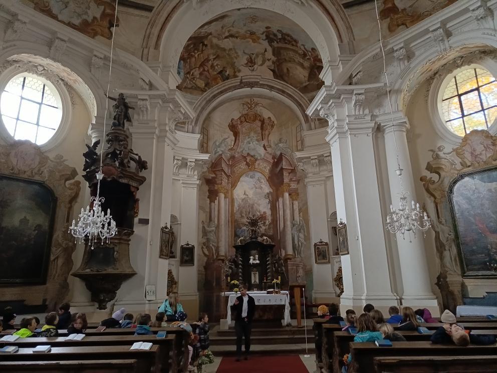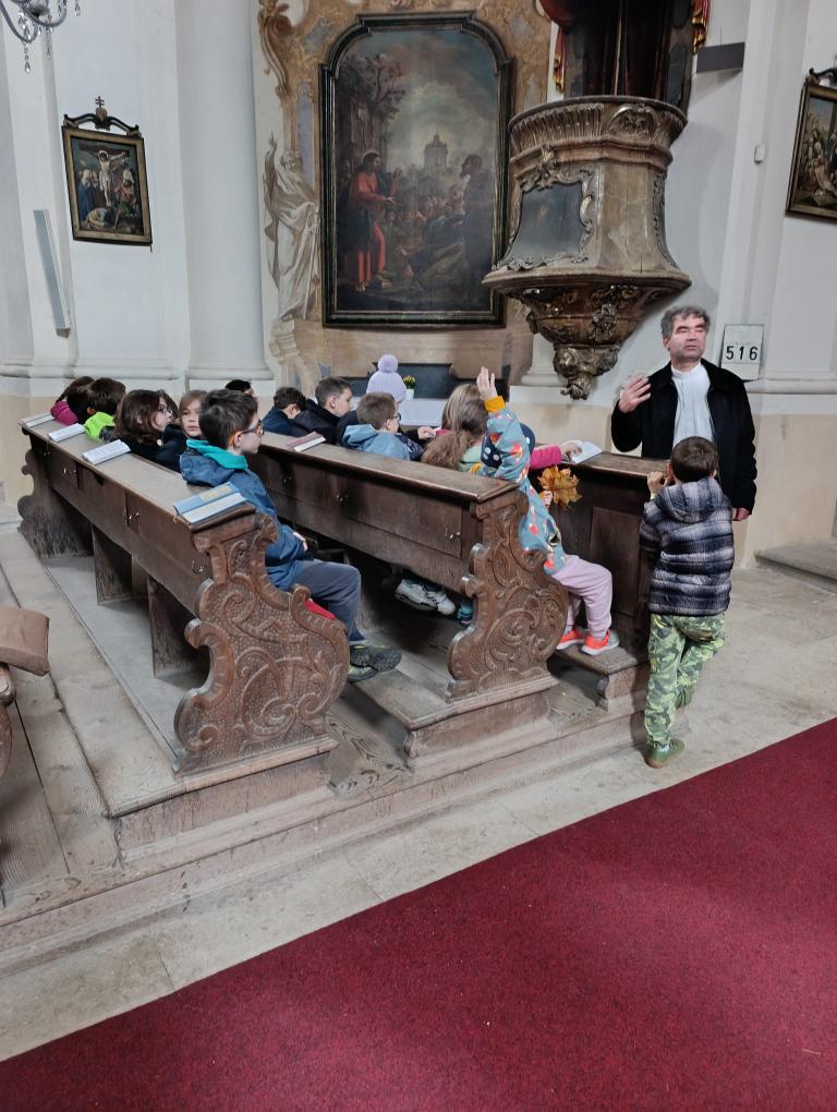 Po příchodu nás přivítal pan farář, který si pro nás připravil zajímavý a poutavý výklad. Vyprávěl o tom, kdy byl kostel postaven, jak se měnil v průběhu let a co všechno se zde odehrává během roku. Děti se dozvěděly, že kostel není jen místem bohoslužeb, ale i prostorem setkávání lidí, pomoci druhým a klidu.
